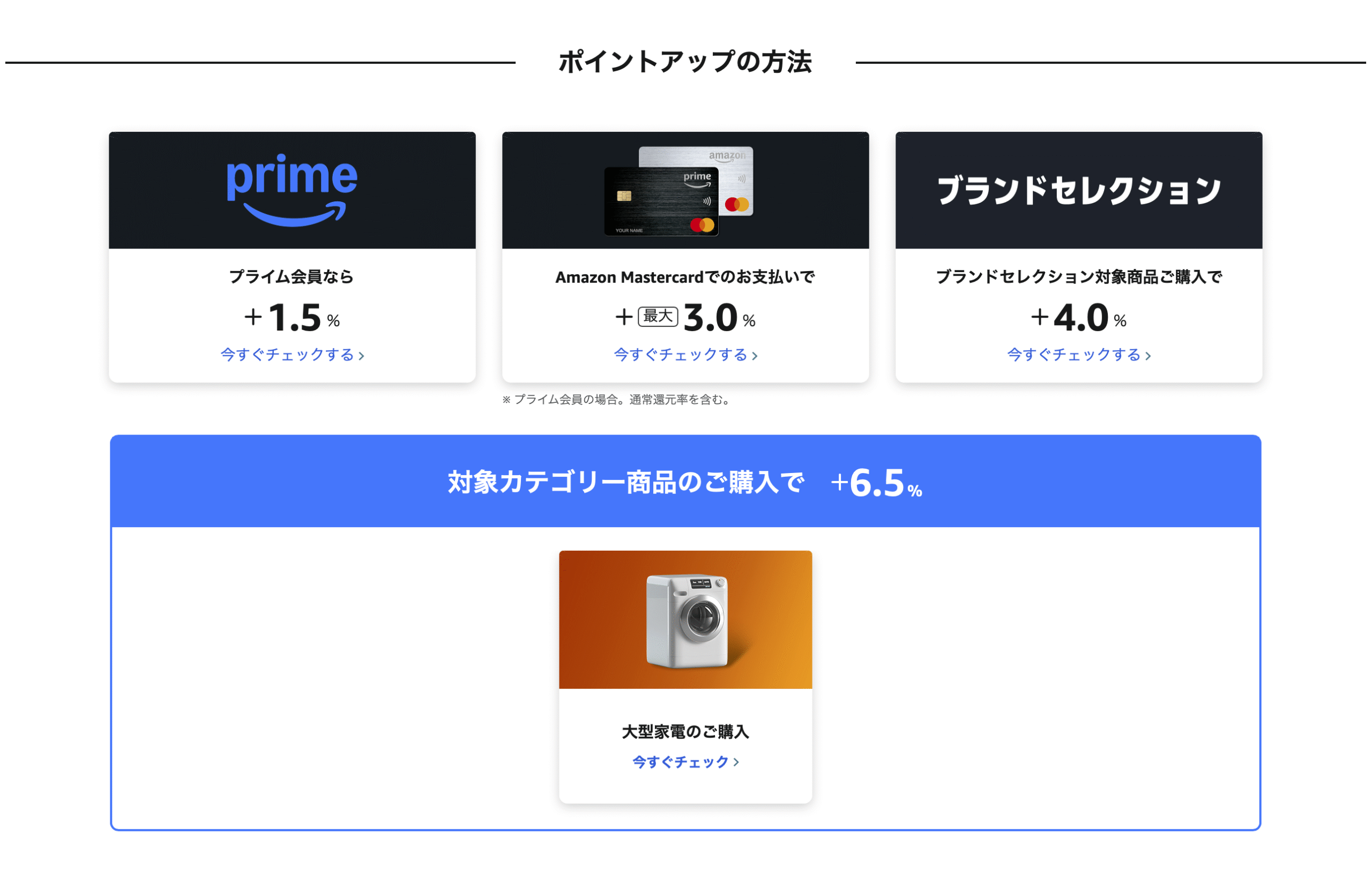 また、プライム会員なら+1.5%、Amazon Mastercard利用で+3%、ブランドセレクション対象商品購入で+4%、大型家電など対象カテゴリ製品購入で+6.5%のポイントアップが適用されます。