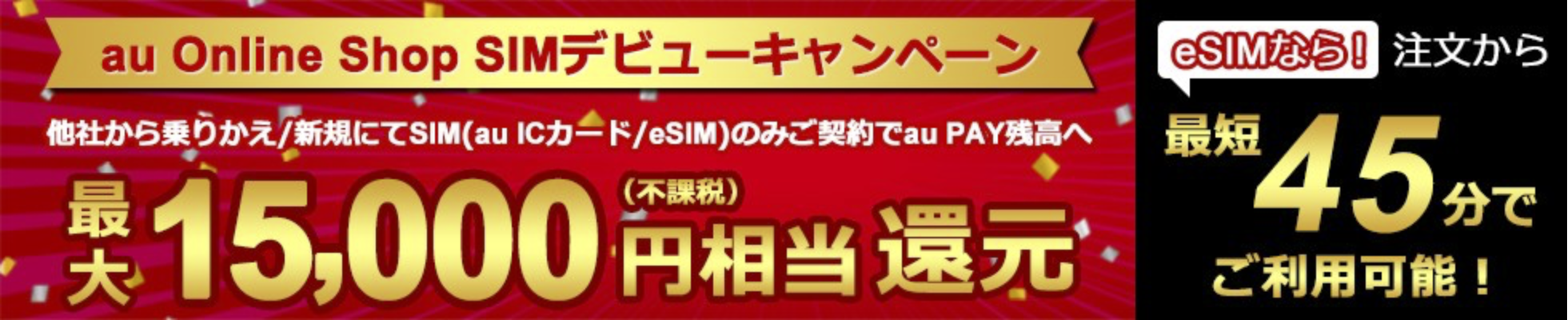 SIMのみキャンペーンの特典は、au PAY 残高へ最大15,000円相当(不課税)が還元されるというもの。