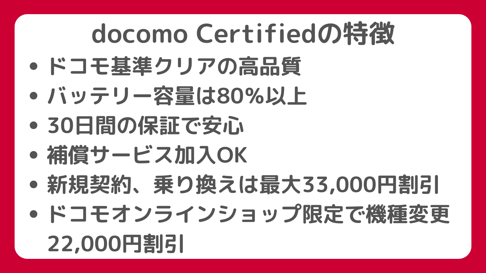docomo Certifiedは、新規契約・乗り換えで購入することでに最大33,000円割引も受けることができます。