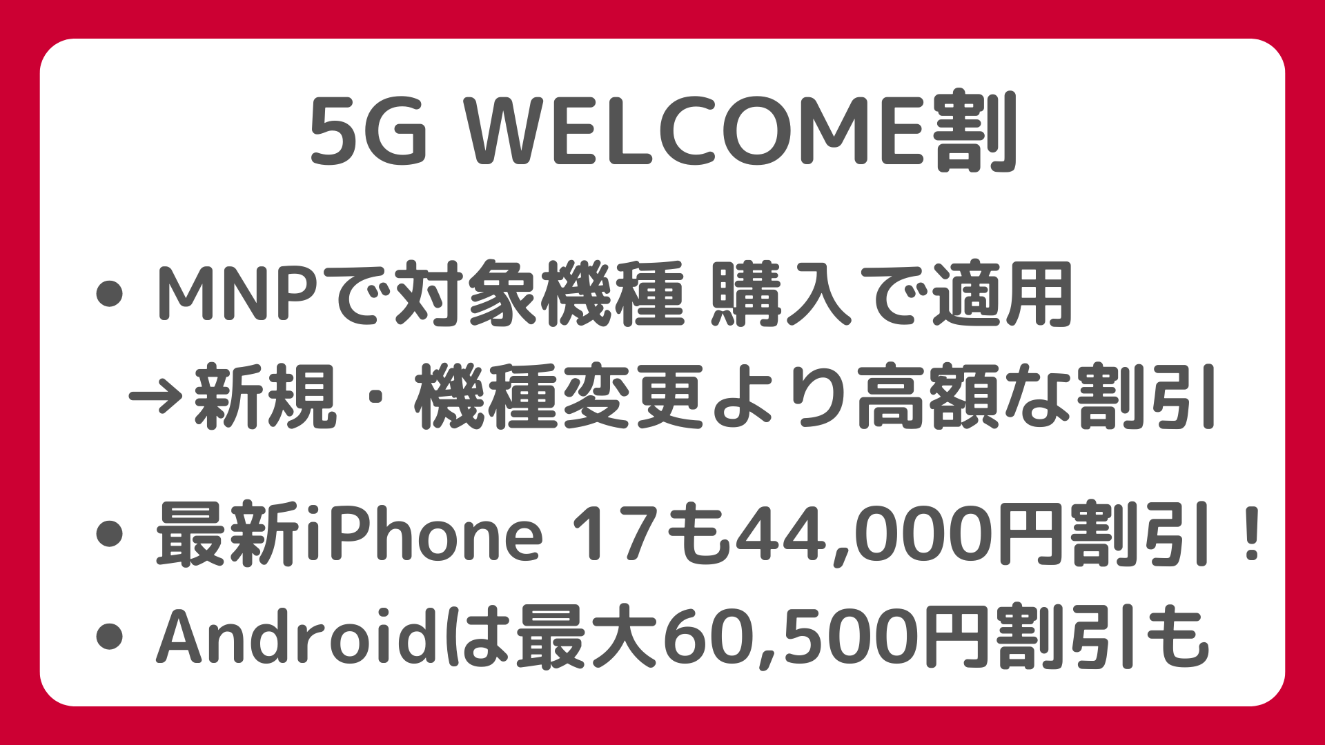 端末購入と同時に乗り換える場合は、5G WELCOM割対象機種なら最大60,500円割引など機種代金の大幅値引きが受けられます。