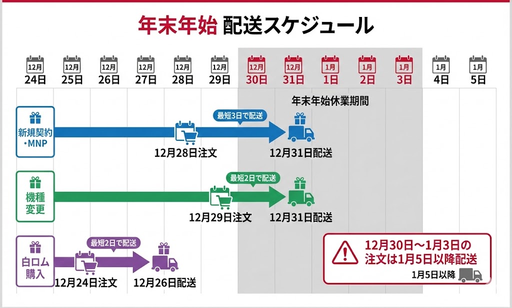 年内にスマートフォンを受け取りたい場合は、新規・のりかえなら12月28日まで、機種変更なら12月29日までに注文を完了させることが重要です。
