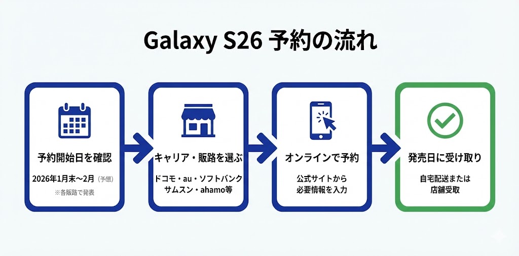 Galaxy S26の予約は、発表イベントと同時または直後に 開始されるのが通例です。