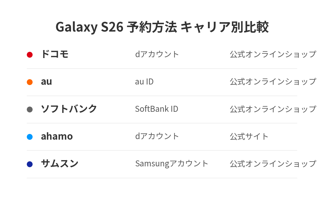 | キャリア・販路 | S26予約必要なもの | Galaxy S26予約方法 |