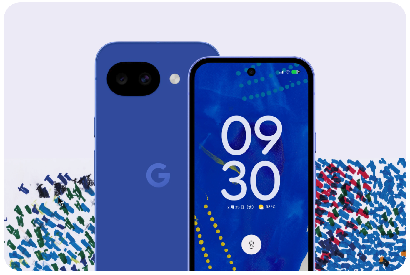 Google Pixel 10aには、日本限定カラー「Isai Blue」が用意されています。これはGoogleとヘラルボニーが共創したモデルで、ヘラルボニーの契約作家の作品が彩る壁紙やテーマが搭載されています。