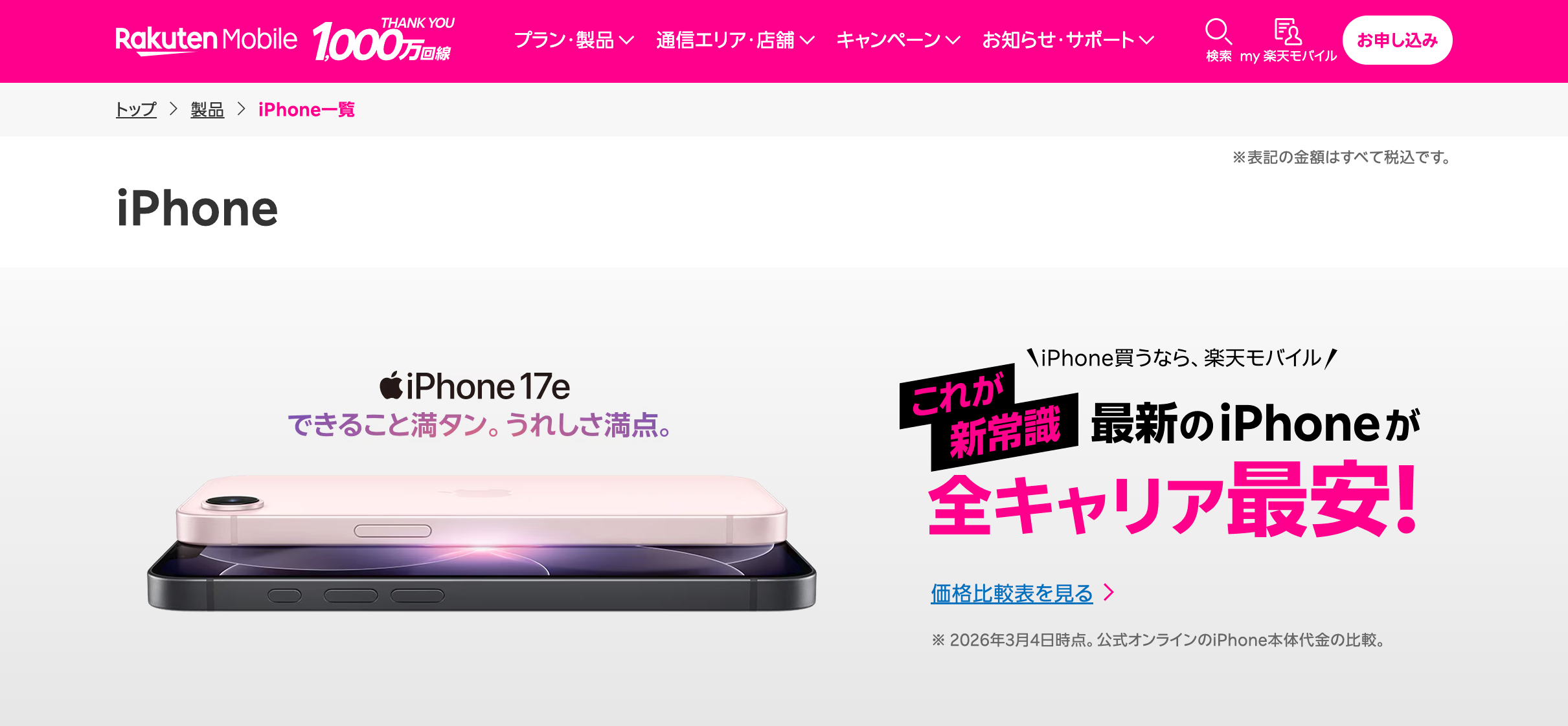 楽天モバイルはキャリア各社の中でiPhone17eの本体価格が最安(2026年3月4日時点、NTTドコモ・au・ソフトバンクとの比較)。さらに各種キャンペーンを活用することで、実質負担額を大幅に抑えることができます。