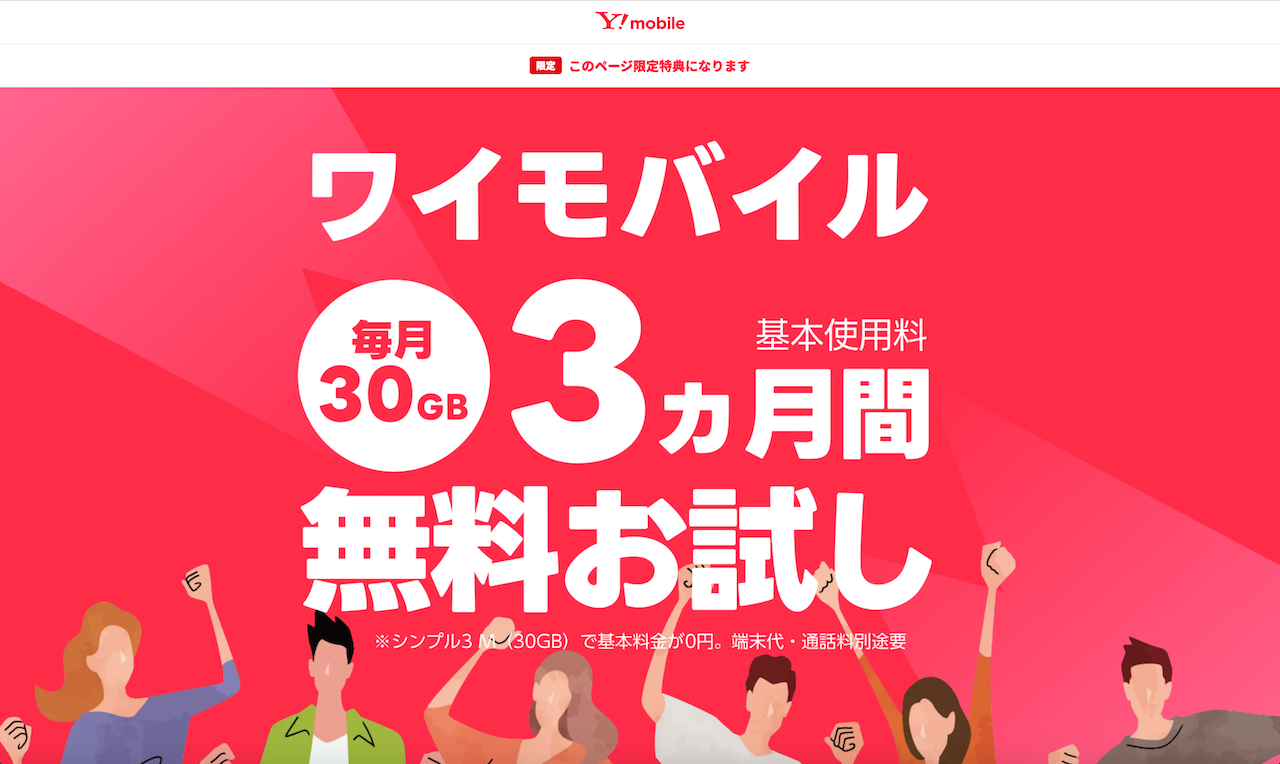 ワイモバイルSIMトライアルは、専用ページから申し込むことで、シンプル3 M(30GB)の月額基本料が3ヵ月間0円になるキャンペーンです。
