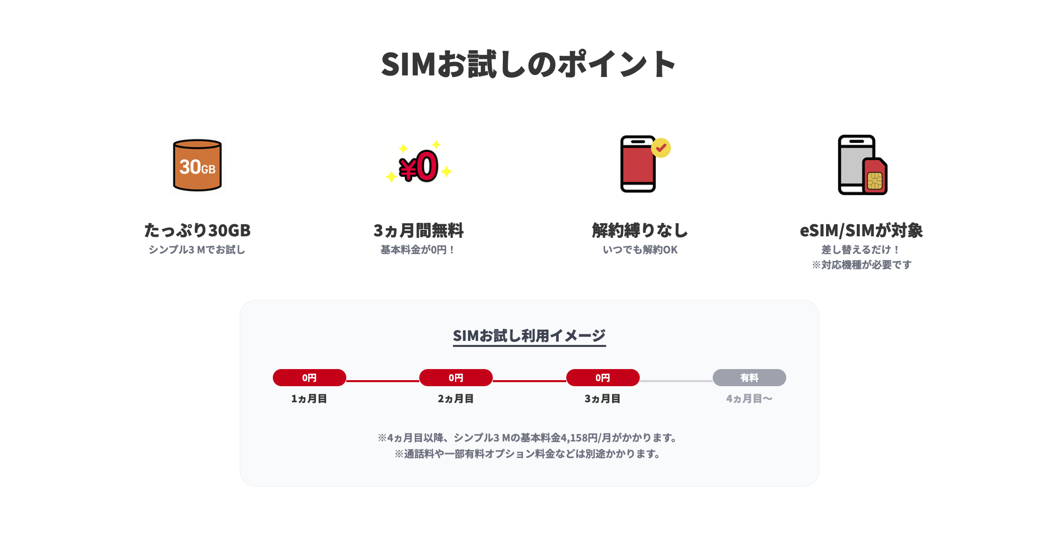 SIMトライアルの無料期間は3ヵ月間です。4ヵ月目以降は自動でシンプル3 M(30GB)の通常料金、**月額4,158円(税込)**が発生します。