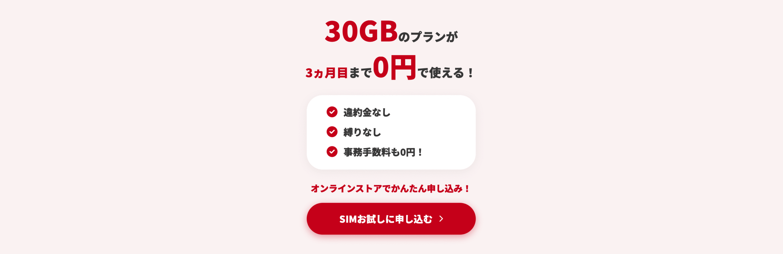 ワイモバイルSIMトライアル(お試し割)は、30GBのプランが3ヵ月間0円で使える、非常にハードルの低いキャンペーンです。
